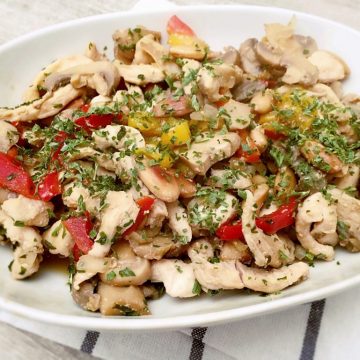• Refogar na mesma frigideira a cebola com os pimentos, cerca de 5min. Acrescentar os cogumelos e o frango marinado. Deixar cozinhar durante cerca de 15 min até estar cozinhado. Se começar a secar, pode juntar-se um pouco de água.