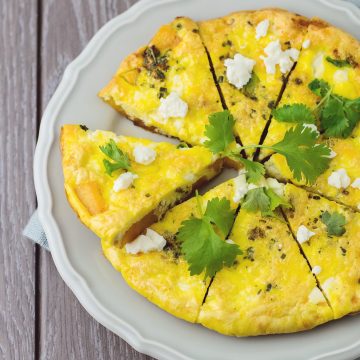 Bater os ovos com as especiarias. Adicionar à frigideira e colocar por cima o queijo feta em cubos.